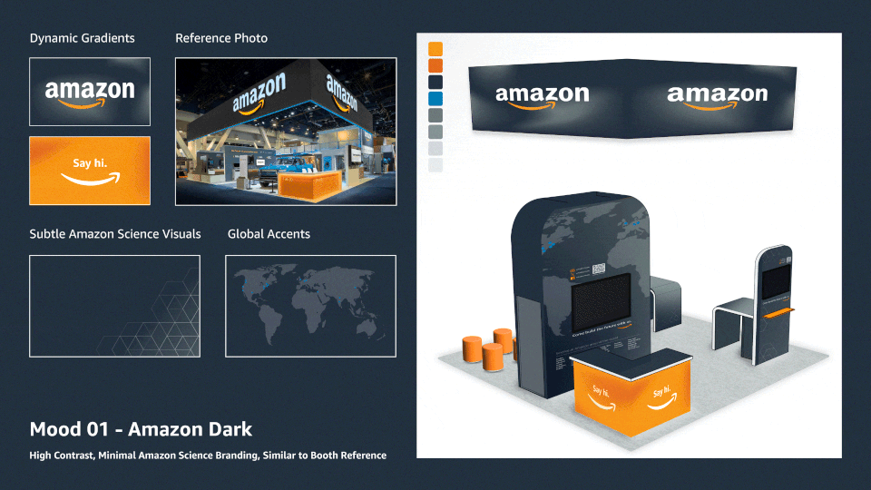 One of the team's core demands was highlighting the larger Amazon brand (smile arrow, orange accents) in an effort to draw attention to a recognizable company at the convention.